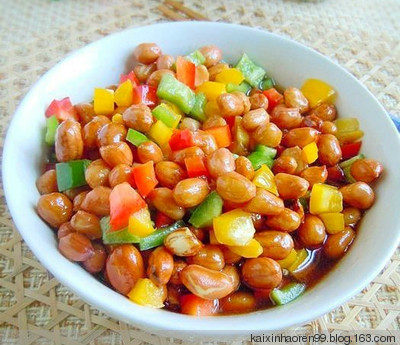 食材:10g青椒、10g彩椒、500g花生米、5g花生油、2g白酒、5g老陈醋、2g生抽、3g白糖、2g盐、1g鸡精