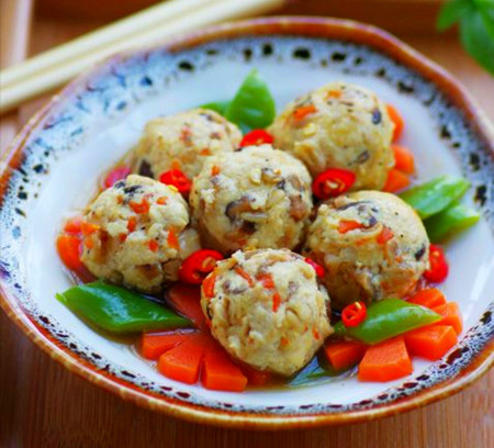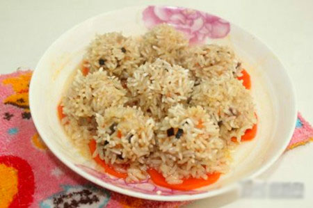 做法:1)材料:把胡萝卜、香菇、洋葱切细和肉馅加调料搅拌一起 浸泡的糯米2)切几片红萝卜垫底 防止丸子粘碟3)取肉馅揉成圆4)放在糯米里滚5)把圆子都滚上糯米6)依次做好所有的珍珠丸子7)放到蒸锅里蒸25分钟即可