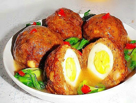 做法:1)肉馅里加入 鸡蛋 酱油 料酒 葱姜碎 五香粉 盐 淀粉 香油 鸡精。顺着一个方向搅拌均匀。2)用手摔打至粘稠。3)鸡蛋煮熟,把鸡蛋皮剥掉。4)馒头切块用冷水泡透成面糊。5)把馒头糊挤干水分,放进打好的肉馅里。搅拌均匀成粘稠状。6)锅中放入大量的油大火烧热。7)把肉馅分成四份,取一份在手上按扁。8)把鸡蛋放在按扁的肉饼上。9)包好滚圆。10)下入,油温八成热的油锅里炸至金黄。11)炸好的丸子码放在盘中,加入葱段 姜片,高汤,放进蒸锅。蒸制15分钟即可。12)蒸好的丸子码放在另一个盘中。13)剩下的汤汁滤掉葱姜。倒入炒锅中烧开。14)芶入薄芡点入香油。15)浇在丸子上,点缀油菜即可。