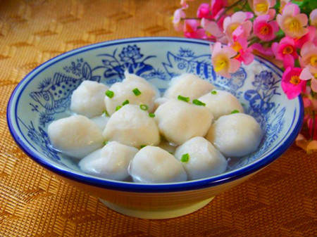食材:500g鱼肉、500g水、160g淀粉、10g猪油、5g姜、10g盐