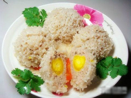 做法:1)将鸡蛋磕到碗里、猪肉剁碎,香菇洗净切碎、糯米浸泡2小时。2)肉馅中放入香菇末、葱、姜、料酒、生抽、盐、味精、蛋清、淀粉。3)顺着一个方向搅拌均匀。4)盘中放入胡萝卜片,取适量肉馅按扁放入蛋黄包起来,外边裹上糯米团圆。5)将每个都做好,放入盘中。6)锅里加足量水烧开,放入肉丸大火蒸40分钟。7)出锅加香菜点缀,即可享用。8)切开一个,看中间的蛋黄很诱人吧。