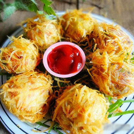 做法:1)土豆切成细丝,放在清水中冲洗三遍,洗去淀粉。2)豆腐捏碎,洋葱、青椒、火腿切细末,拌在一起。3)加入少许盐、鸡精和五香粉搅拌均匀。4)将鹌鹑蛋裹上豆腐泥,团成球状。5)将做好的豆腐球表面沾上一层干淀粉。6)土豆丝控干水份。7)再将豆腐丸子裹上一层土豆丝。8)锅中倒色拉油烧至五成热时放入土豆丸子开中小火炸至金黄色捞出即成。