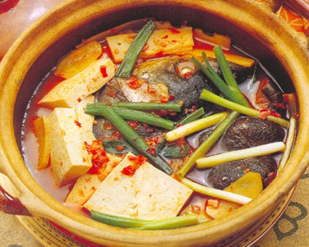 制法:(1)粉皮泡好切成1厘米宽的长条。冬笋、冬菇、猪肥瘦肉切成片,青蒜切在段。(2)花生油烧沸,把鱼头用料酒抹一下,放油锅内炸至金黄色捞起,放入砂锅内。(3)油锅烧热,把肉片、冬笋、冬菇煸炒均匀,随下泡辣椒、酱油、料酒、白糖、清汤、盐,汤开后倒入砂锅内。(4)砂锅烧开后,盖好盖,移小火烧之,鱼头烧透后,把粉皮放入,略开片刻,放入味精,调好味,放进青蒜段,原砂锅上桌。