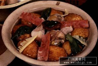 7,配 料: 猪肘肉100克、带骨雏鸡肉100克。 鸡蛋60克,火腿25克、青菜心25克。酱油20克、清汤100克、葱段15克、姜片10克、精盐5克、味精1克、菜油100克。 操 作: 1、猪肘肉、带骨雏鸡肉均剁成3.3厘米见方的块,放入开水锅中氽过,取出放入砂锅内。 2、鸡蛋煮熟剥去壳,沾匀酱油。放入油锅中炸成金黄色捞出,摆入砂锅的四周,火腿、青菜心均切成小象眼片。砂锅内放入清汤、绍酒、葱段、姜