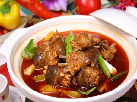 特点:鲜香微辣,美味可口。 在做“砂锅牛肉”这道菜的时候,火候是必须要重视的,恰到好处的火候,才能做出鲜嫩而不烂的效果。这份砂锅牛肉就是最好的典范,鲜嫩的牛肉配上西红柿的红艳,再加上青菜叶的衬托,就像绿叶与鲜花一样漂亮。长时间小火慢炖,成就了牛肉的鲜香。夹一块放入口中,滑嫩鲜香立刻袭满口腔。厨师还点破了煲这道菜的诀窍,要先用旺火烧开,然后用小火慢炖而成,这叫“多汤慢火法”。
