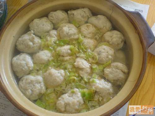 7、所有的丸子做好入锅煮2分钟,再放入粉条、白菜煮2分钟,加剩余的盐、胡椒粉和鸡精调匀,最后撒入少许葱末。
