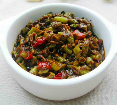 做法:1)豆角切小段。2)干辣椒切段,蒜切末,姜切末。3)碗内放一勺甜面酱,两勺豆瓣酱。4)加适量水,搅拌均匀。5)锅内放油,将蒜和姜爆香。6)倒入调好的酱和干辣椒,小火翻炒两分钟。7)倒入豆角末翻炒三分钟。8)小火焖一分钟即可。