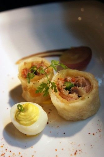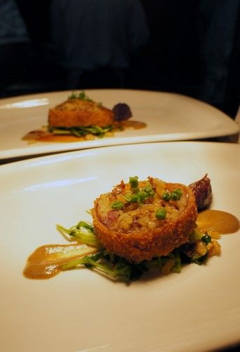 进入第二道主菜,猪腿卷和猪尾卷的做法有些相似,也是外层香脆内层鲜嫩的口感。不同的是,这次内里添加了鹅肝和烩饭,更像是西餐版的八宝鸭。Austin将份量控制得刚好,不会撑到吃不下。
