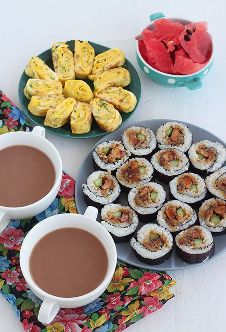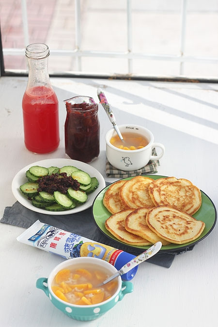 18、晚上睡觉前将面糊和好早晨已发酵好,做了超级松软的玉米饼(不过这次我没放糖,放了一个鸡蛋和一大勺奶粉),抹自己熬的果酱或者蓝莓炼乳、奶酪吃;煮了红薯粥;拌了小黄瓜;水果是鲜榨的西瓜汁!