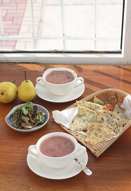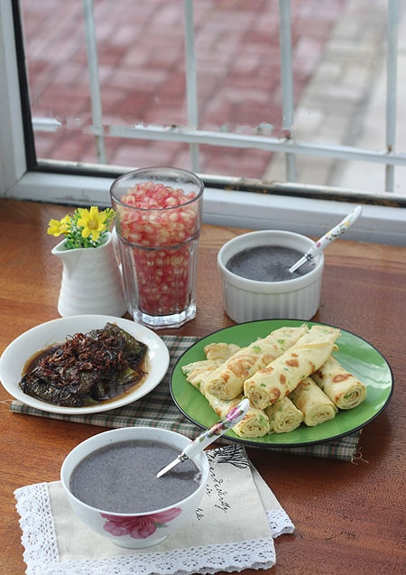 3、葱香鸡蛋饼;剩的米饭锅底加了一把黑芝麻放水搅打成黑芝麻米糊;晚上又做了一个油焖尖椒,早晨起来吃更入味不太辣,放了一把我的绝密武器虾皮味道超好。晚上睡觉前剥了一杯石榴,我喜欢吃!