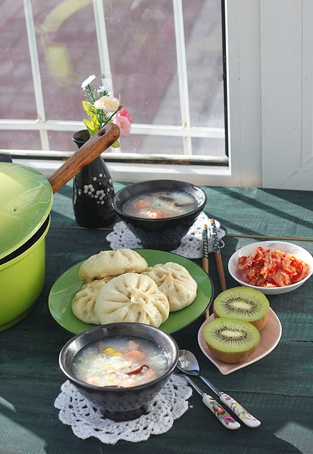 5、早晨起来下雨了,天空阴沉沉的,凉意越来越重了。剩了1把油菜,晚上热水焯了一下再加上粉丝和肉末葱花,早晨起来包了10多个烫面蒸饺,烫面是烙葱油饼剩的冷藏在冰箱里的;剩米饭锅底放了一块切碎的南瓜加水用豆浆机做的南瓜米糊;凉拌豇豆;一个猕猴桃,切开;