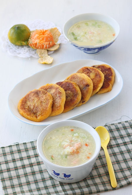 13、晚上蒸了地瓜趁热放入糯米粉用勺子搅成团,豆沙馅冰箱里始终有做好的,早晨起来做了包有豆馅地瓜饼,又煮了虾滑粥,里面放了芹菜和胡萝卜!