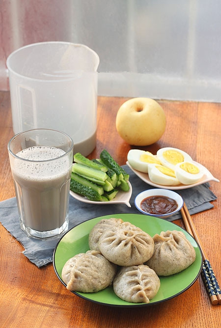 14、平时打豆浆过滤出来的豆渣都冷冻保存,用来放到馒头包子中,这样既不会浪费又有营养,昨晚做的芹菜肉黑豆渣包子,芹菜茎叶全部留下洗净没有焯直接切成末放入肉馅中,这样营养一点不流失,而且芹菜味浓;早上又打了黑豆浆,还有煮蛋,黄瓜蘸酱!
