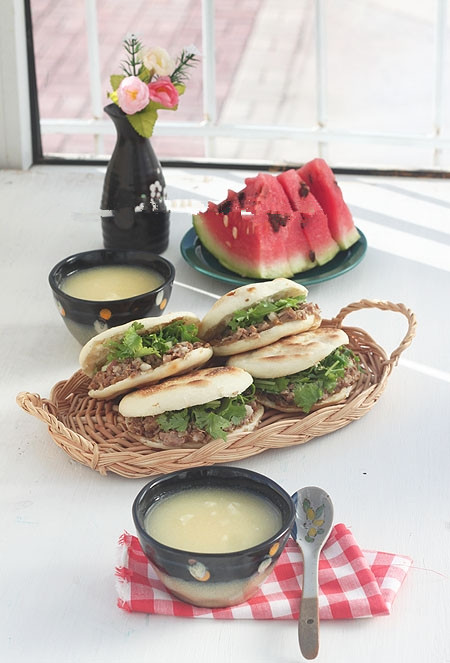 17、晚上翻冰箱看到一大块前几天买的猪肉,冷藏里还有几棵香菜,于是用高压锅酱了肉,剩下的连汤一起分成了小份以后用,睡前发了面,早晨做了肉夹馍、煮了麦片玉米粥,切几片西瓜!
