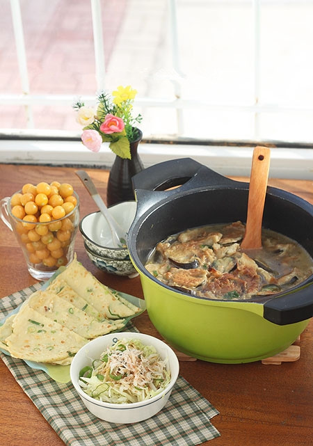 19、做了3个小茄子的茄粑子,因为面衣裹得好,所以做出来一小锅;盆里剩下点面糊又加了葱花一点面粉和水顺手煎了一张蛋饼;白菜丝葱花、虾皮拌了个小菜;水果是东北的黄菇茑
