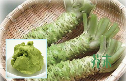 芥末,辛热无毒,具有温中散寒,通利五脏、利膈开胃的作用,能利九窍、健胃消食等。芥末香辣味可刺激唾液和胃液的分泌,有开胃之功,能增强人的食欲。它还具有解毒功能,能解鱼蟹之毒,故生食三文鱼等生鲜食品经常会配上芥末。