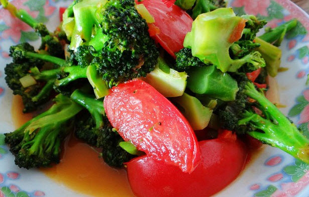 2、番茄洗净,剥去外皮,切成块,蒜切成薄片,西兰花埂切成小块;