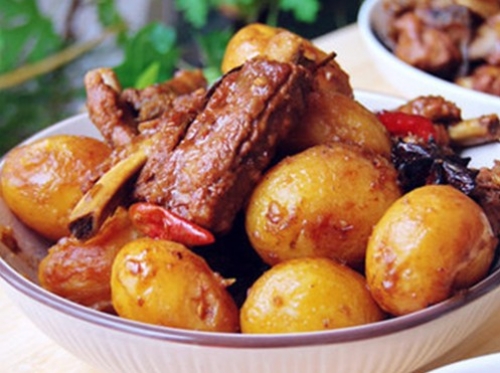 原料:排骨,土豆。配料:老抽(上色)、生抽(上味)、砂糖:适量、姜片:适量、料酒:15ML。喜欢辣的,就用老干妈火锅料吧,我加了一调羹,用豆瓣酱也行。或者干脆不加辣味,味道就是酱排骨的味道了。