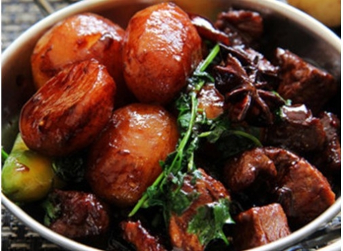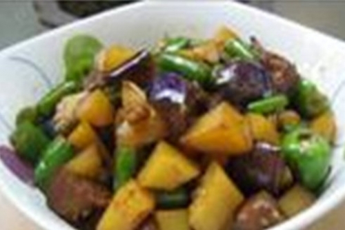 做法:炒锅内加油,烧热后下葱花爆锅,然后下肉翻炒几下,放点盐和酱油适量;将土豆和茄子同时下锅,翻炒;在炒的过程中加盐、鸡精、味精、少量的醋;翻炒到基本上茄子都过了油、土豆颜色加深后,向锅内加清水,水量控制到菜的四分之三位置;盖上锅盖炖一会,出锅前20秒左右加准备好的大蒜、香菜或者香油。