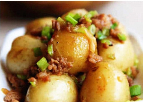 原料:小土豆500克、肉末150克、香葱80克、油2匙、盐、生抽1匙、糖、黑花椒粉、姜