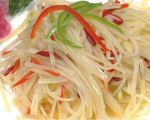 ③将烫好的土豆丝捞起,放在盆里,撒上蒜末、辣椒面(事先炸好的辣椒油也可以),不过没有现炸的香。