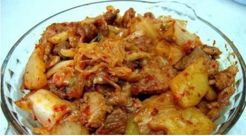 ④入土豆片,辣白菜,放少量鸡精,胡椒粉爆炒,充分翻炒让肉,土豆片都沾上辣白菜的味道。