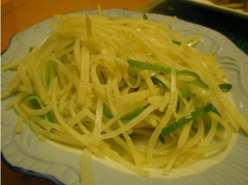 另外,如果炒的时候加黑醋,起锅之前加糖,就成了糖醋土豆丝,但是之前就不要加花椒啦。糖切记不可在锅里停留时间过长,会糊的。