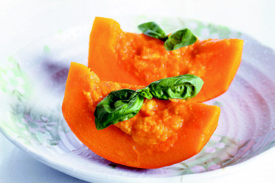 材料:南瓜1粒、鮭魚肉100g、蝦肉100g、蛋黃1個,鹽、白胡椒、太白粉、薑泥適量、羅勒葉少許。