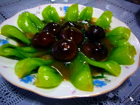 【食材】香菇6朵、油菜200g、油适量、盐适量、花椒面适量、老汤适量、淀粉适量、蚝油适量。