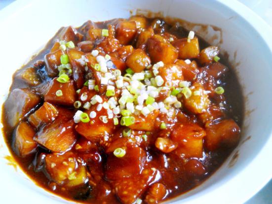 方法:碗里放酱油、醋、盐、糖、蒜末、水加淀粉拌好。茄子去皮切滚刀块在淡盐水泡十分钟沥干,锅里放油,油热下茄子,炸炸就捞出来沥油。然后锅里多的油倒了,下炸好的茄子,翻炒下把拌好的料汁倒进去,炖炖炖~\(≧▽≦)/~,收收汁出国撒葱花香菜就可以开吃咯~甜甜的,黏黏的,软软的 = =放个图吧,就这个有图可放,还是个不满意的图,囧。