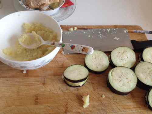 5、把土豆泥塞进茄子里,如下图