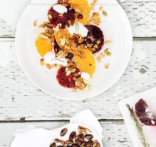 橙子、开心果、麦片、酸奶