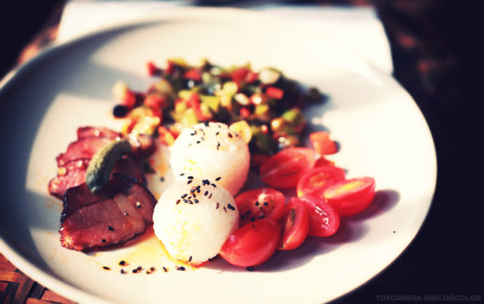 食材:米饭、 腊肉、辣椒、葫芦卜、豌豆粒、小西红柿、芝麻、老干妈辣椒酱