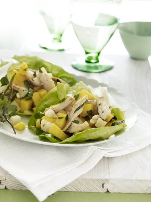 材料:1个大的成熟芒果,去皮切碎;1杯切碎的豆薯;1/2杯包装新鲜薄荷叶,切碎;1/4杯新鲜酸橙汁;2汤匙特级初榨橄榄油;1/2茶匙亚洲辣椒酱(Sriracha),可以带来更好的味道;盐;3杯粗碎鸡肉(1/2只烤鸡);12片生菜叶。