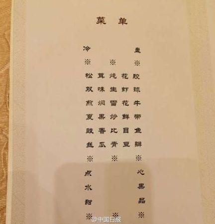 2014习近平夫妇欢迎出席“亚信峰会”国宴菜单