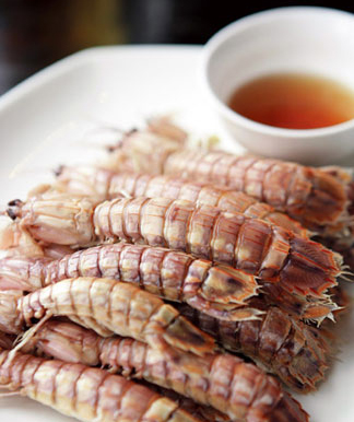 海水煮虾虎接着上来了。相当低调,一指多长每一个都长得一样大。当吃到第三只的时候,厨师脸上的得意再也盖不住了。一盘经过选美般一模一样的虾虎(皮皮虾)全是母的,且每个都有饱满的黄。火候刚好,虾肉甜美,有些干硬的黄是不一样的口感。
