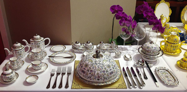 2014年11月10日,APEC国宴在奥运会场馆“水立方”举行,此次欢迎晚宴所使用的餐具,并不似以往国宴中使用的偏素色餐具,帝王黄的珐琅彩瓷在国宴主桌上异常抢眼。据此次国宴餐具主创设计师之一庄志诚介绍,这套餐具是以《诗经》中词句“和鸾雍雍万福攸同”寓意为主题设计,专为APEC国宴而作,“和鸾是车马上的铃铛,在设计的主体纹样中为磬纹,宝磬是礼乐之器,有祝福之意。和鸾雍雍,万福攸同,宾客至,同多福。”