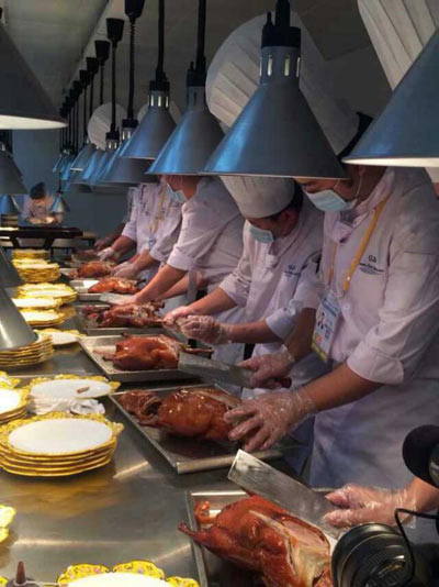 烤鸭是北京特色美食,原料选取上好的填鸭,具有肥瘦分明,鲜嫩适度,不腥不酸的特点。烤鸭中富含优质蛋白,涵盖人体必须的8种必需氨基酸,同时钙、磷、铁等矿物质含量也丰富。俗话说“只有民族的,才是世界的”。各国嘉宾不仅要吃的开心,还要吃完回味,一生难忘。要实现这个目标,就需要拿出举办地的特色美食,本届APEC会议在北京举办,烤鸭自然少不了。顾及到现场有3个经济体的嘉宾不吃**,餐饮团队特意为其准备了“五福蔬菜卷”,分别由黄瓜丝、胡萝卜丝、山药丝、杏鲍菇丝、姜丝调制专用酱汁,外以鸭饼包裹。这五种原材料搭配在一起,不但营养丰富,口感俱佳,更有“五福临门”的寓意。