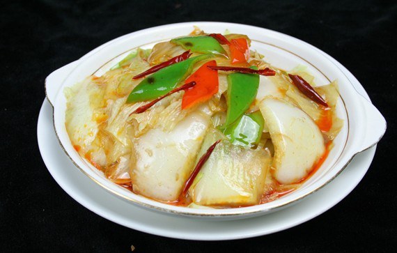 2.炒勺上火烧热,注入适量烹调油,下入花椒煸香,再倒入干辣椒丁和姜丝煸香,煸香小料后,下入大白菜,用旺火翻炒均匀,把大白菜炒匀后倒入事先勾兑好的碗芡,仍用大火翻炒,待汁芡糊化后便可出锅。