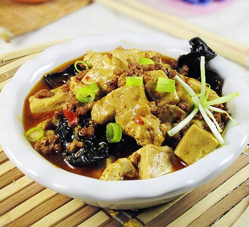 2.锅中注油,下入郫县辣酱煸炒出红油后下入葱姜炒香,放入肉馅煸炒至变色,烹入料酒,加入酱油 糖煸炒均匀,下入煮好的豆腐和木耳,再加入适量的清水,烧开后,转中火,烧至汤汁浓缩。 勾入薄芡,加入鸡精调味即可。