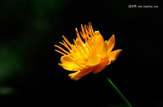 七月初到八月末,金莲花如万点金星落地,四野一片金黄,漫野铺去格外耀眼。