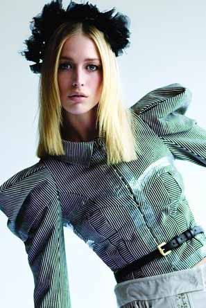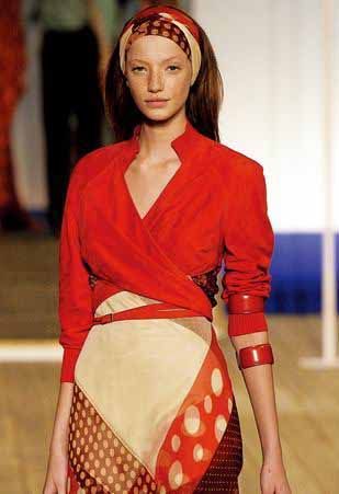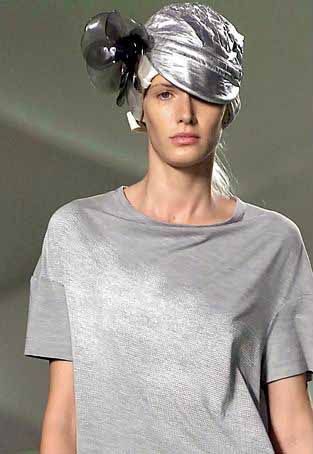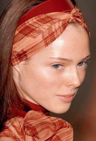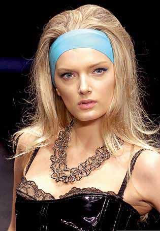 发型师奥兰多?皮塔最为懂得如何将酷酷而又随意的感觉演绎到极致,他为Marni时装秀所搭配的纤细弹力发带就完美地体现了这一点。首先,先把头发向后梳,在头底部扎起来,然后再将一个弹力细发带戴在距前额1英寸的地方。如果脸型较大的话,还可以再挑出发带前几处主要位置的头发,将它们弄松,制造出零乱感。