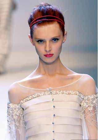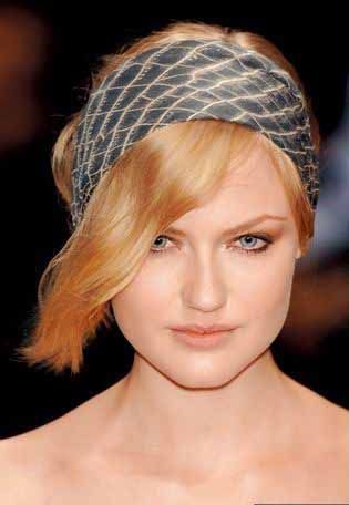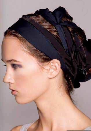 那种1英寸宽的普通发带戴上去总是给人“太青春”的感觉。可以尝试一下将一个细细的绸带绕在头上,然后将尾端在头发下面系起来。最近Chanel推出的系列使用的就是这种造型,很有一点学生气的清纯。如果你觉得这有点过,那么也可以用绸带简单地在头后绑个松松的马尾辫。