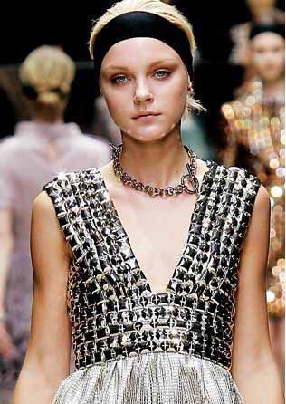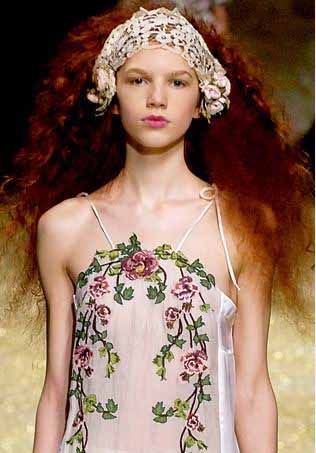 选择两个极端——要么宽大,要么细致。较大的比较适合Marc Jacobs,Burberry或者D&G的风格,宽大的发带会成为一个吸引注意力的亮点。然而,在Valentino的秀台上,模特却佩戴了两个闪亮、鲜红的细发带,两条发带间距1英寸左右,戴在离发际线非常靠近的位置。这带来了两种非常不同的感觉:较大的能把周围的头发包裹住,发带看起来非常的运动和朋克,而较细的发带则更有女人味。