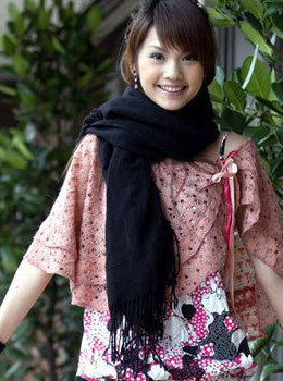 点评:齐刘海加上翘马尾可爱又动人,露肩的粉色斗篷小毛衣提升性感的女人味。