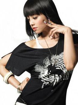 点评:黑色的t衫让齐刘海的mm也能很独特,衣身上的图案也很别致当然提升亮点。