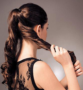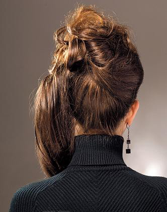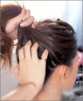 step2.将整头发丝收拢成高于枕骨的马尾后,过程中以手指代替发梳,可制造出具个性感的发线轨迹。