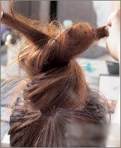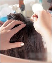 step6.手指随机浅插于前额及头顶上方,将指尖微往回推并喷上定型液,制造出凌乱的细部发线。