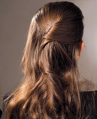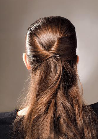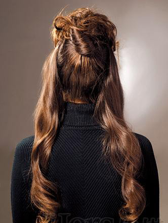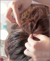 3、将右侧拧转的发束盘旋在脑后,用小发夹固定;左侧发束也以同样方式拧转后盘上;