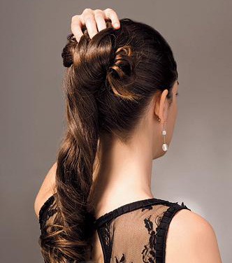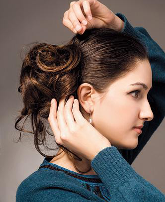 3、将发束依次按逆时针方向盘旋至头顶,注意位置一定要稍高些;调整发稍,尽可能将发梢卷曲的位置朝向前方,然后调整脑后的发束,以定型喷雾固定。